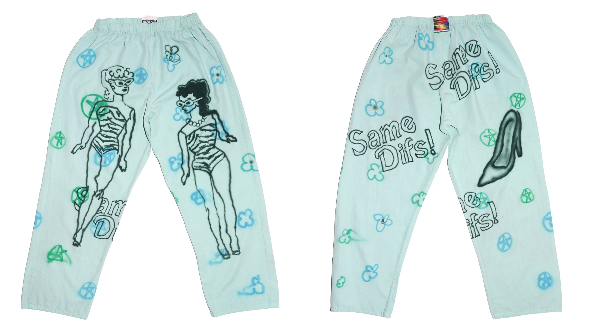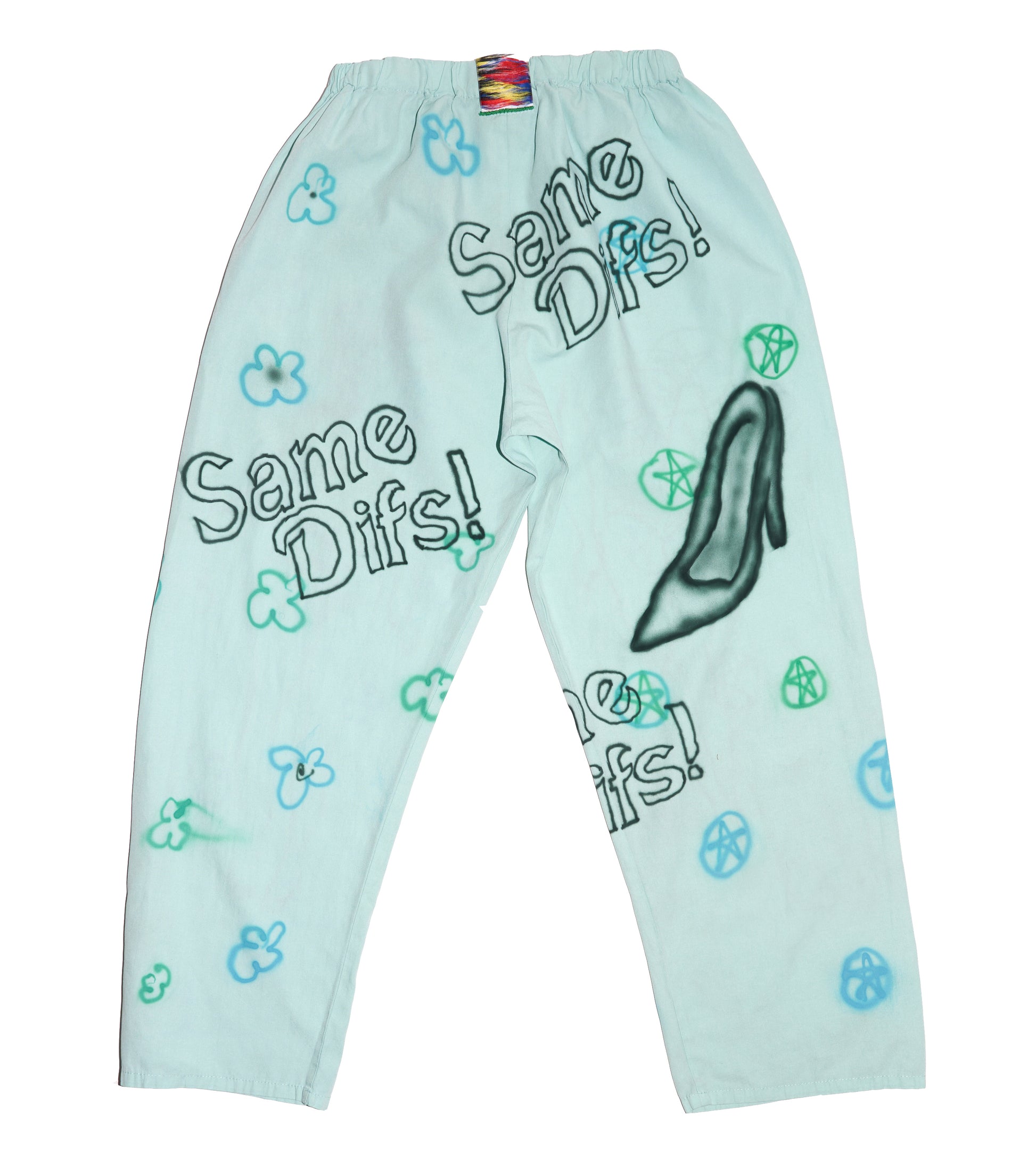 Vintage light blue pull on trousers with elastic waist, airbrushed bestie barbs and same diffs patterning